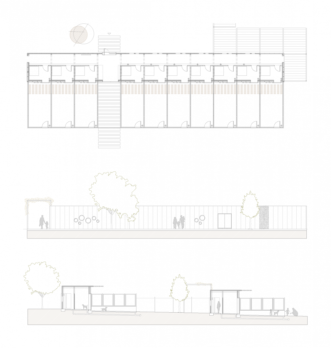 La repetición de un módulo constante a lo largo del proyecto permite concebir el mismo a través de sistemas semi-prefabricados que, mediante su agregación, configuran un conjunto compacto en su funcionamiento pero difuso en sus límites para favorecer el diálogo con el paisaje y la convivencia de las múltiples circulaciones de personas y animales.